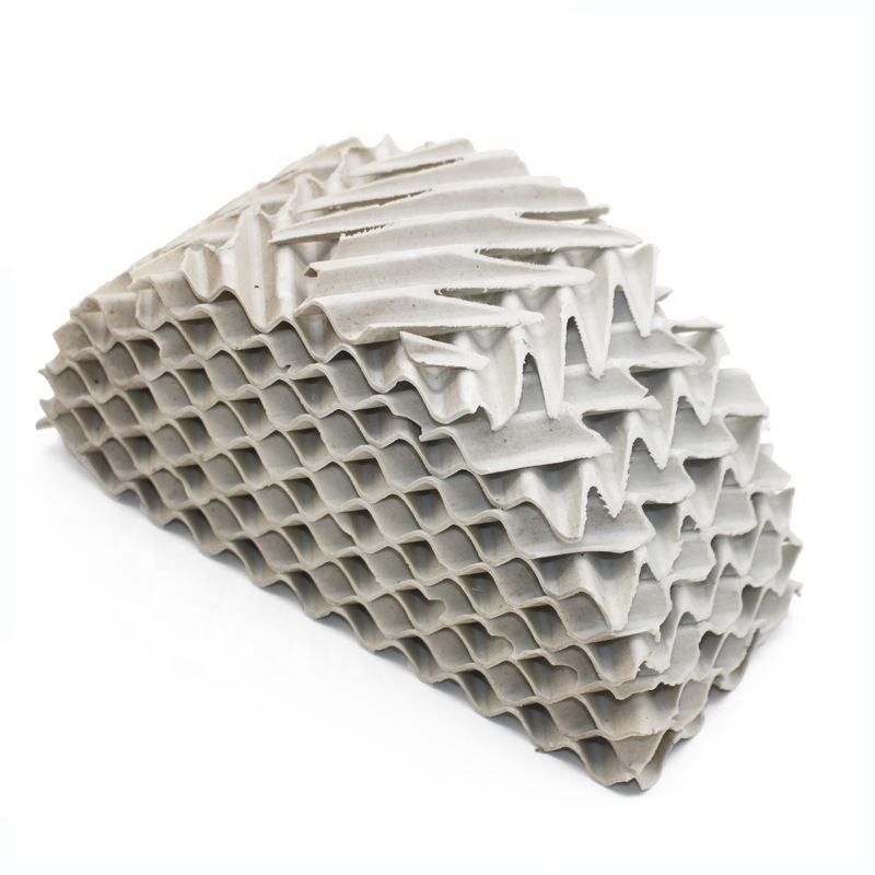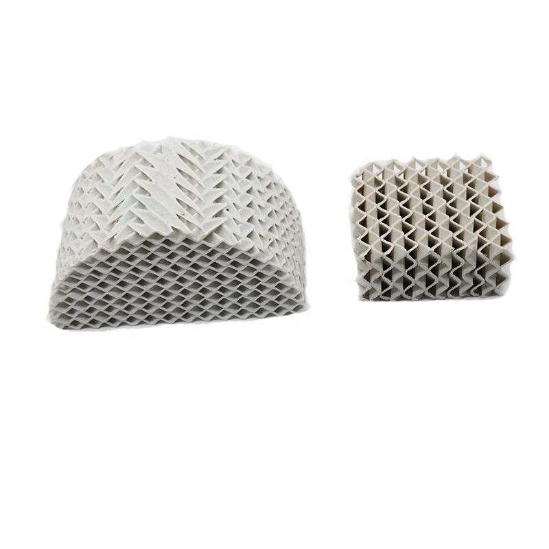 Ceramic structured packing is a tower packing that is arranged in a uniform geometric pattern and neatly stacked in the tower. Structured packing mainly replaces random packing in the tower to solve prominent problems such as large resistance, small specific surface area, poor mass transfer efficiency, and easy breakage. It stipulates the gas liquid flow path, improves the channel flow, wall flow and wetting performance, reduces resistance, and provides more gas liquid contact area to improve the mass transfer and heat transfer effect,It can be widely used in gas washing towers,coking washing, benzene washing, ammonia washing towers, fertilizer hot gas saturation, desulfurization, sulfuric acid drying, absorption towers etc. Ceramic corrugated structured packing is made of hard porcelain, and the main components are clay, quartz, feldspar etc, which are specially baked. It is formed by many unit corrugated sheets with the same geometric shape parallel to each other and cross stacked.