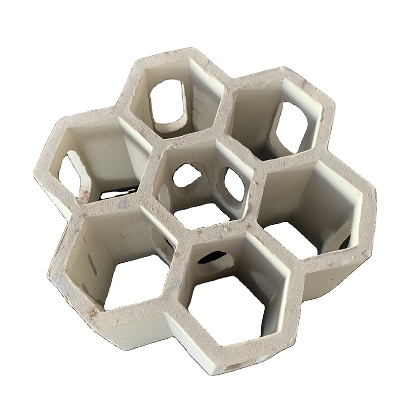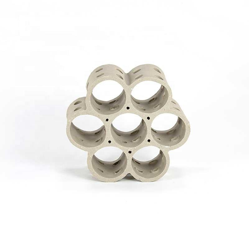 The stacking weight of light ceramic filler products is 280-350kg/m3, which is much lower than the stacking density of ordinary regular fillers. The stacking porosity of the product is ≥ 72%, the apparent porosity is ≥ 15%, and the total porosity is over 85%. The structure has the advantages of light weight, small load, low operating resistance, and reduced pressure of the packed tower.